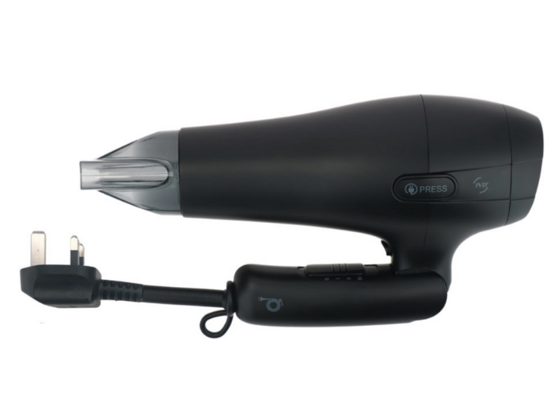 ROLLEO Matt Black Foldable Hair Dryer 2100W, on/off switch system, DC motor, 3 drying configurations with cold shot. With ionizing system, removable nozzle and back filter. With extendable retractable cord and plug.
