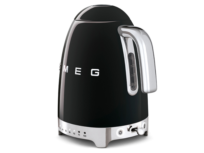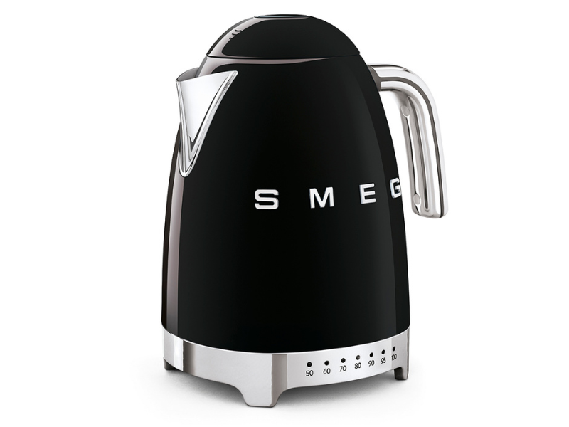 The Smeg KLF04 variable temperature kettle offers customizable water temperature settings ranging from 50°C to 100°C, perfect for various beverages and brewing preferences.