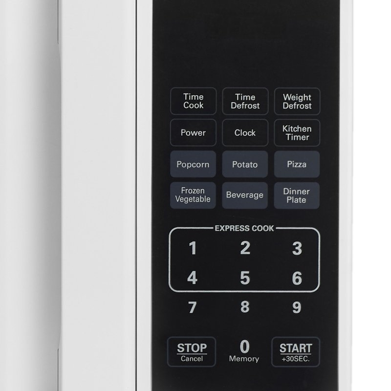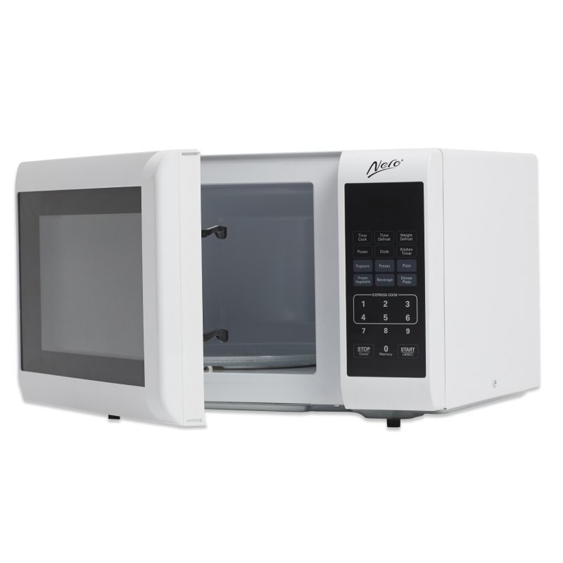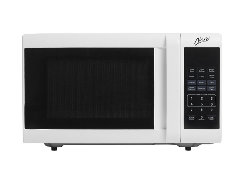 Compact white conventional 23L microwave with cooking time and power setting dials, simple to use with pull door handle.