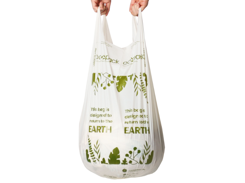 These bags contain a mixture of polymers including PBAT, PLA and a plant-based polymer (such as corn-starch or sugarcane). Compostable materials are designed to degrade in moist conditions and return to carbon dioxide and water without leaving harmful residues in the process.