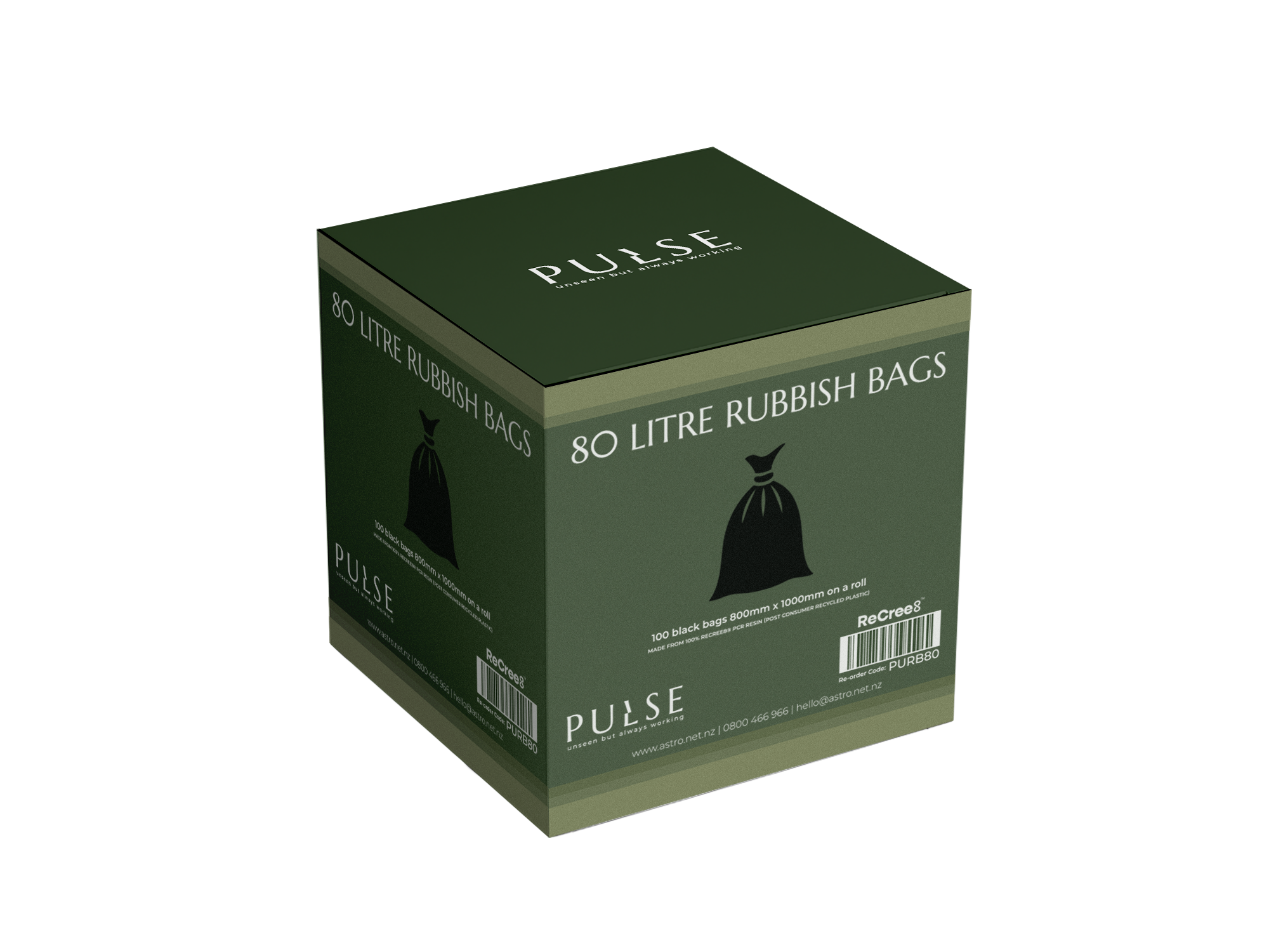 - Pulse 100% Recycled Bin Liners, 80L, Black, 100/roll