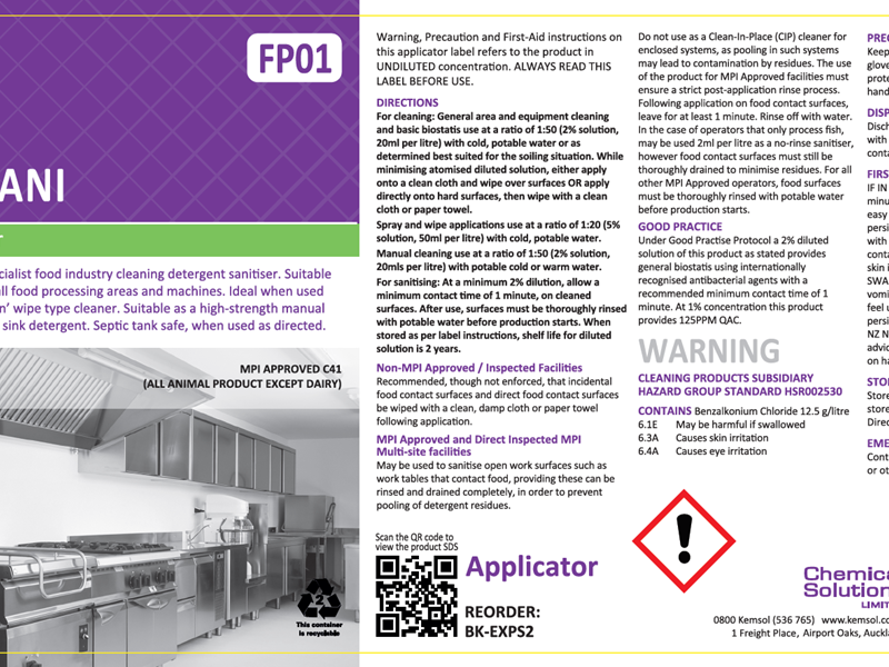 Do not use as a Clean-In-Place (CIP) cleaner for enclosed systems, as pooling in such systems may lead to contamination by residues. The use of the product for MPI Approved facilities must ensure a strict post-application rinse process. Following application on food contact surfaces, leave for at least 1 minute. Rinse off with water. In the case of operators that only process fish, may be used 2ml per litre as a no-rinse sanitiser, however food contact surfaces must still be thoroughly drained to minimise residues. For all other MPI Approved operators, food surfaces must be thoroughly rinsed with potable water before production starts.
