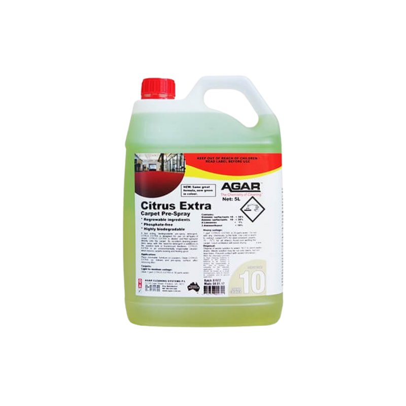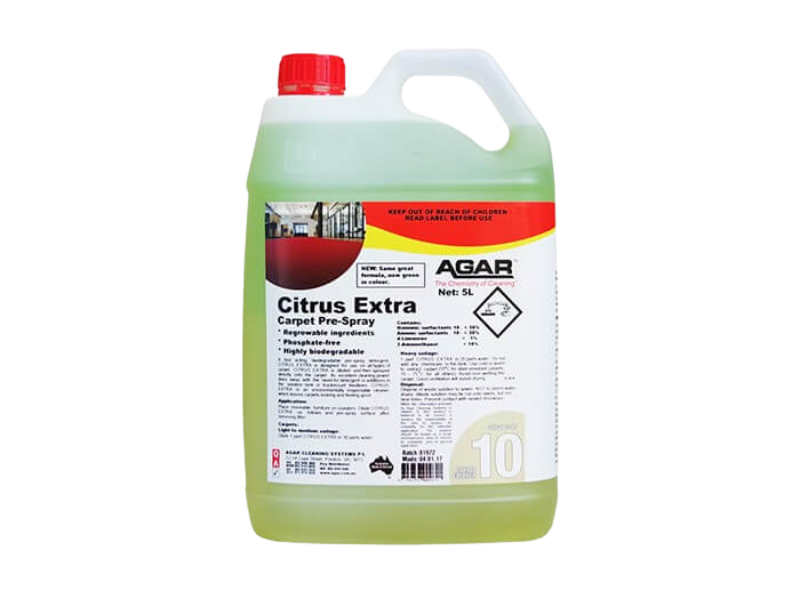Biodegradable, phosphate-free with natural citrus-based ingredients, Citrus Extra is a new-generation pre-spray liquid detergent for HWE carpet cleaning, in compliance with AS 3773. It is safe for general purpose use. The Citrus Extra solution is applied direct to the carpet while only water is used in the solution tank. Citrus Extra is low alkaline, low-foaming and free rinsing.