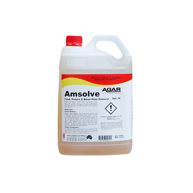 A super effective stain remover for hard to shift spots and spills caused by orange juice, soft drinks, wine, blood and protein-based foodstuffs such as milk, egg, ice-cream and chocolate. Amsolve is also excellent for cleaning and restoring rundown, traffic soiled synthetic fibre carpets.