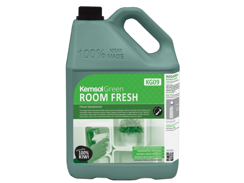 Room Fresh has a two-stage action to odour control. It has an odour neutraliser which attacks odour molecules and neutralises them and also contains a light fragrance which leaves a lingering floral scent. It is ideal for controlling a wide range of malodours including decaying garbage, cooking odours, smoke, animal odours, body odours and for use in bathroom/toilet areas. Room Fresh will work immediately to remove odours. Meets or exceeds EU biodegradability standards and meets Kemsol Green environmental standards.