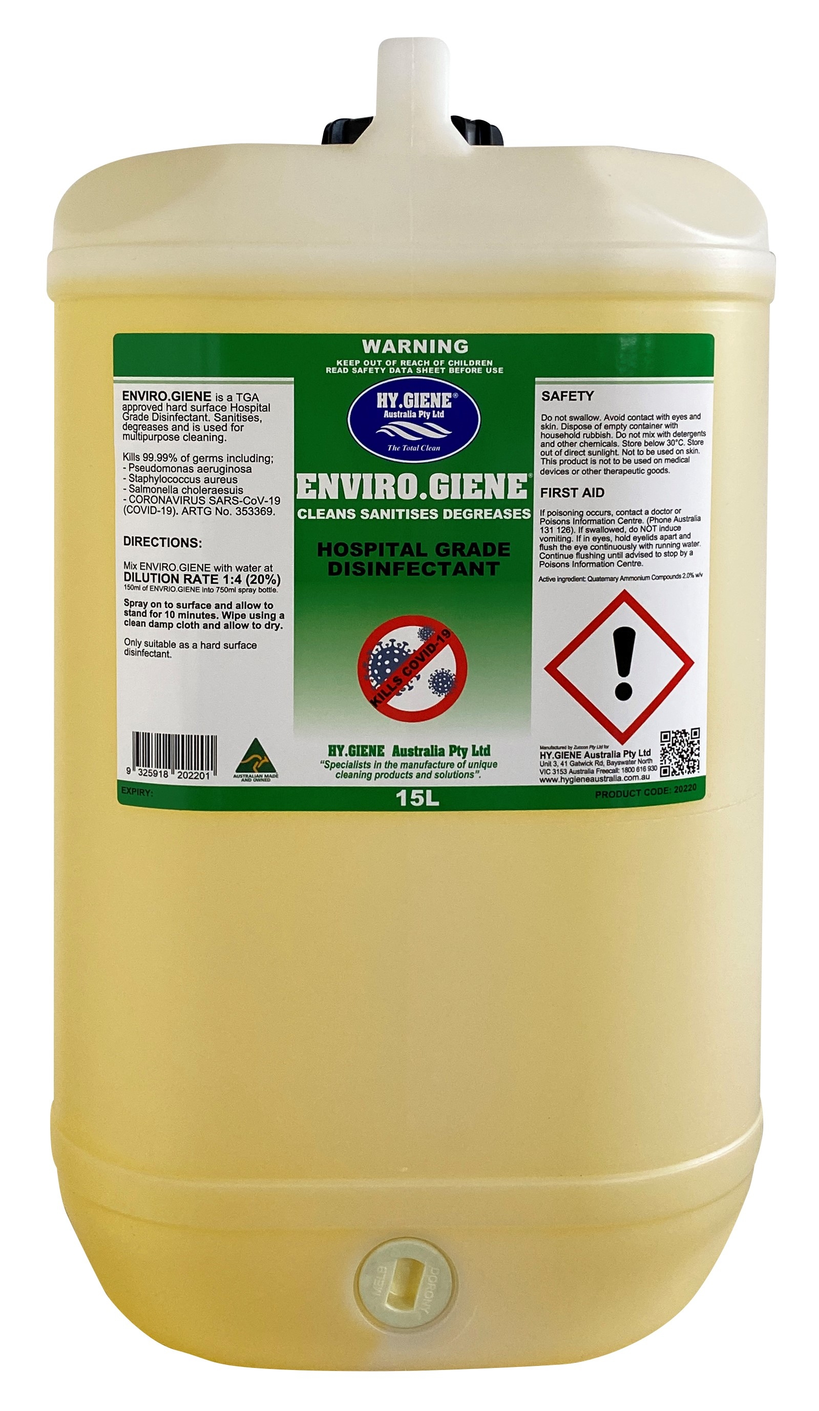ENVIRO.GIENE® is a TGA approved hard surface hospital grade disinfectant and effective multipurpose cleaner 4-in-one product. It delivers potent germicidal action in hard water and organic soil loads. It is formulated with fourth generation quaternary ammonium compounds that have been reported to be broadly active against bacteria, fungi, viruses and algae. The formulation has been generously boosted with surface active agents, alkali and solvent to further enhance its cleaning capability and rapid action on lipophilic (enveloped) viruses.