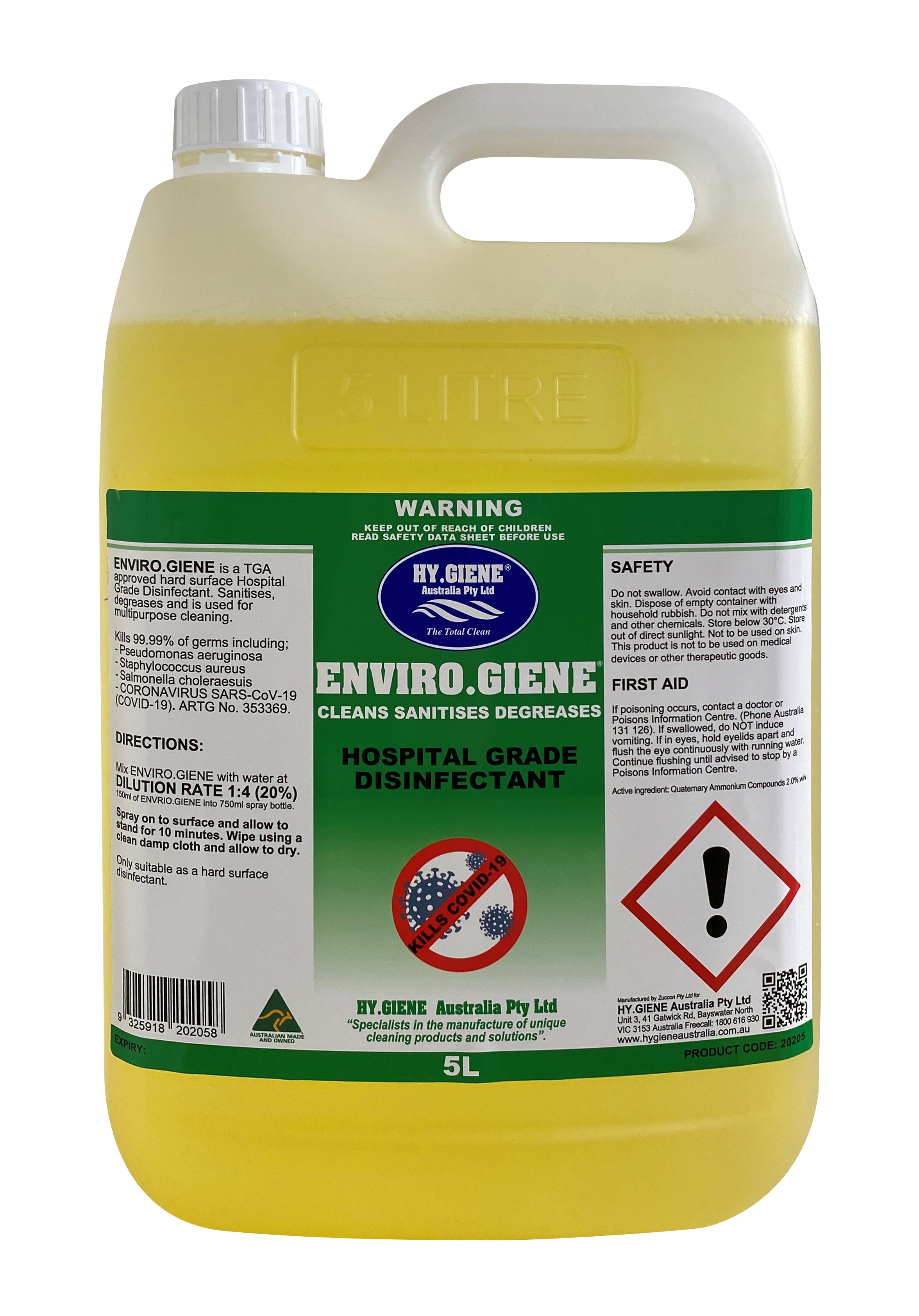 ENVIRO.GIENE® is a TGA approved hard surface hospital grade disinfectant and effective multipurpose cleaner 4-in-one product. It delivers potent germicidal action in hard water and organic soil loads. It is formulated with fourth generation quaternary ammonium compounds that have been reported to be broadly active against bacteria, fungi, viruses and algae. The formulation has been generously boosted with surface active agents, alkali and solvent to further enhance its cleaning capability and rapid action on lipophilic (enveloped) viruses.