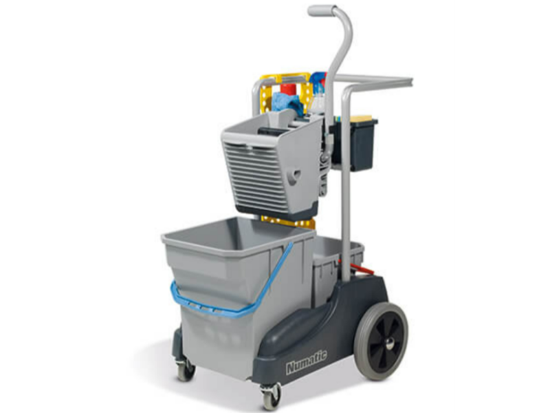 The Twinmop 2815 is a world first, being a complete compact dual bucket mopping system incorporating a large, oversize, clean water bucket, dirty water pail and using Numatic’s patented AWS (Automatic Water Separation) system. A small caddy comes as standard to permit all those essential cloths, sprays, etc to be carried.