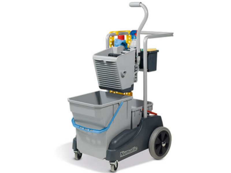 The Twinmop 2815 is a world first, being a complete compact dual bucket mopping system incorporating a large, oversize, clean water bucket, dirty water pail and using Numatic’s patented AWS (Automatic Water Separation) system. A small caddy comes as standard to permit all those essential cloths, sprays, etc to be carried.