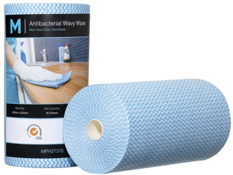 Antibacterial wavy wipes are hygienic and high absorbent. Dispensed on a perforated roll for convenience. These wipes have been treated with antibacterial at the time of manufacture so the roll of green antibacterial wavy wipes is clean and ready to use when remove from the packaging.