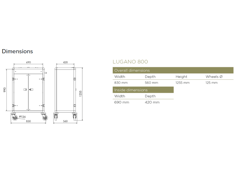 - 4 swivelling wheels Ø125mm with non-marking polyamide layer