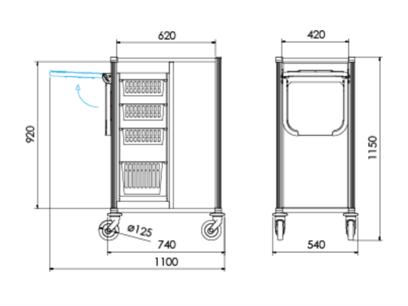 - 4 swivelling wheels Ø 125 mm with non-marking thermoplastic layer