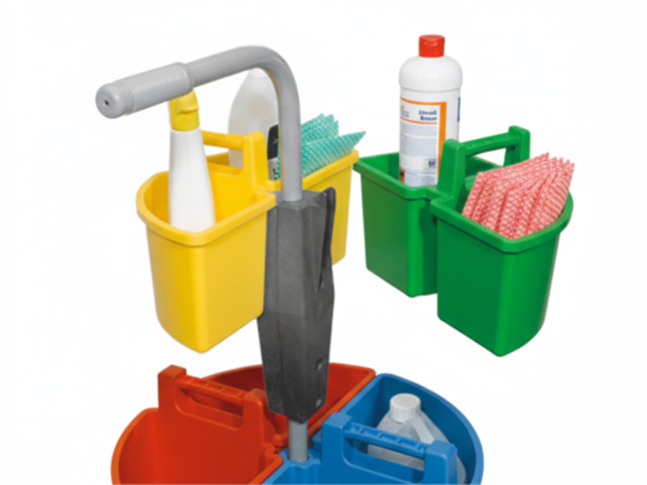 The full colour-coded cleaning mobile that allows full control of the cleaning programme in all applications. Hotels, for example – bedrooms one colour, bathrooms another colour, WCs yet another… a place for everything and everything in its place. Two large and two small twin compartment caddies all together but all easily detachable as required. No system could be simpler or more versatile than the Carousel.