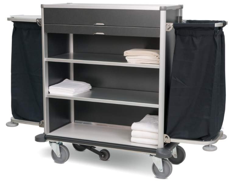 Designed for efficiency and durability, this motorised linen trolley is ideal for hospitality and facility management operations. Featuring an anodised aluminium frame and a comprehensive array of features, it allows for smooth transport, organised storage, and easy handling of linens and cleaning amenities.