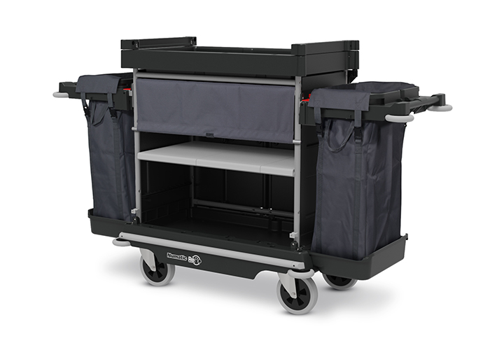 Without doubt, the NuKeeper service trolley is the result of many years of servicing hotel operations. The All-Terrain castors and Structofoam chassis allows for movement inside or out if necessary, not to mention in and out of elevators. The fully integrated cover is so very simple and so practical that it’s always there when you need it and can be used day or night. Comes standard with two 100- litre folding laundry bag extension kits.