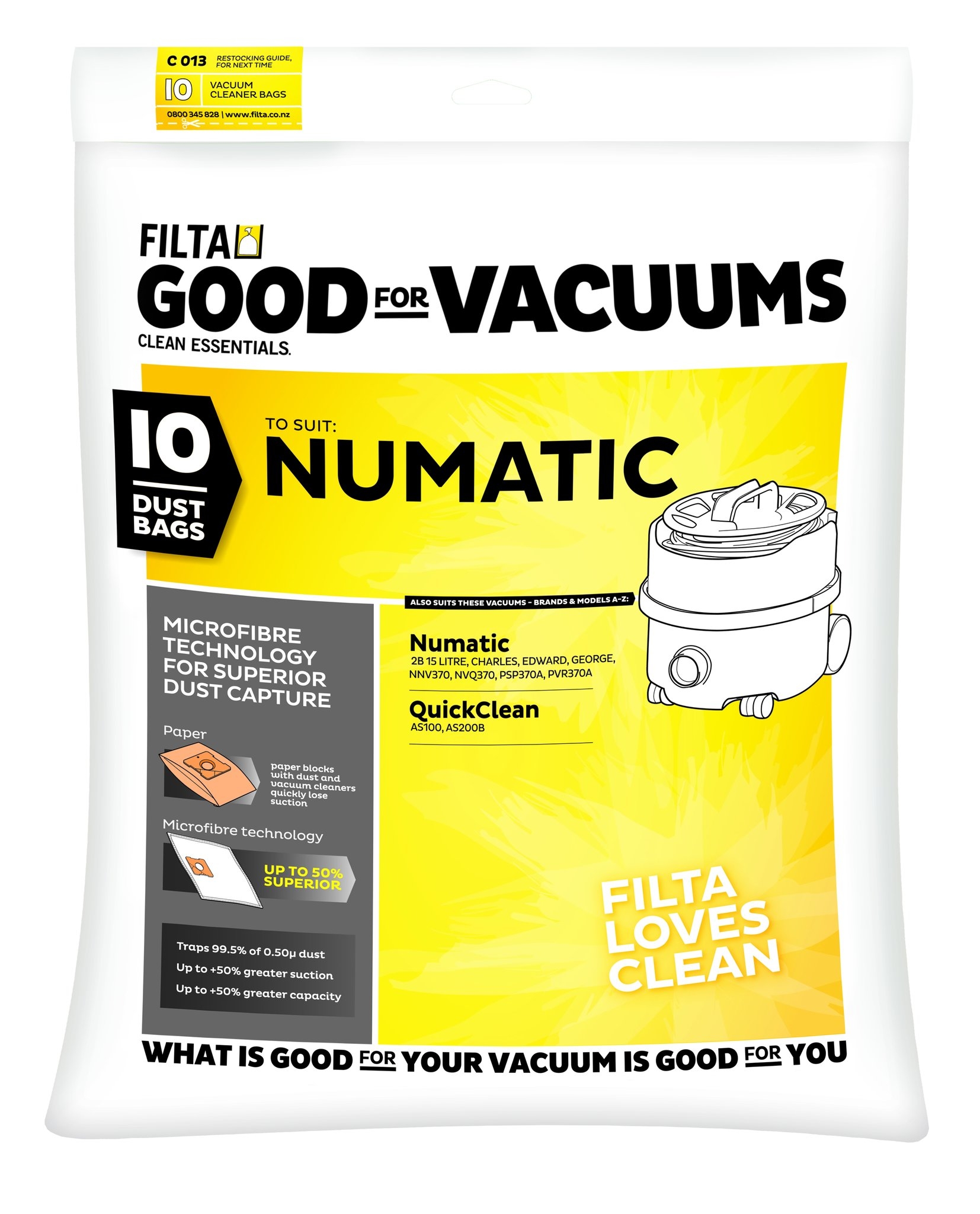 Maintain your vacuum and keep your Workshop or office clean with the Filta Commercial Vacuum Cleaner Bags to suit commercial vacuum cleaners. The unique 5-layer SMS technology provides superior dust capture, ensuring you are always sucking up dirt and dust keeping your worksite or office clean. 2B Numatic vacuum bags Suitable for use with the Numatic models Charles, Edward, George (15L, 2B) 15 litre capacity.