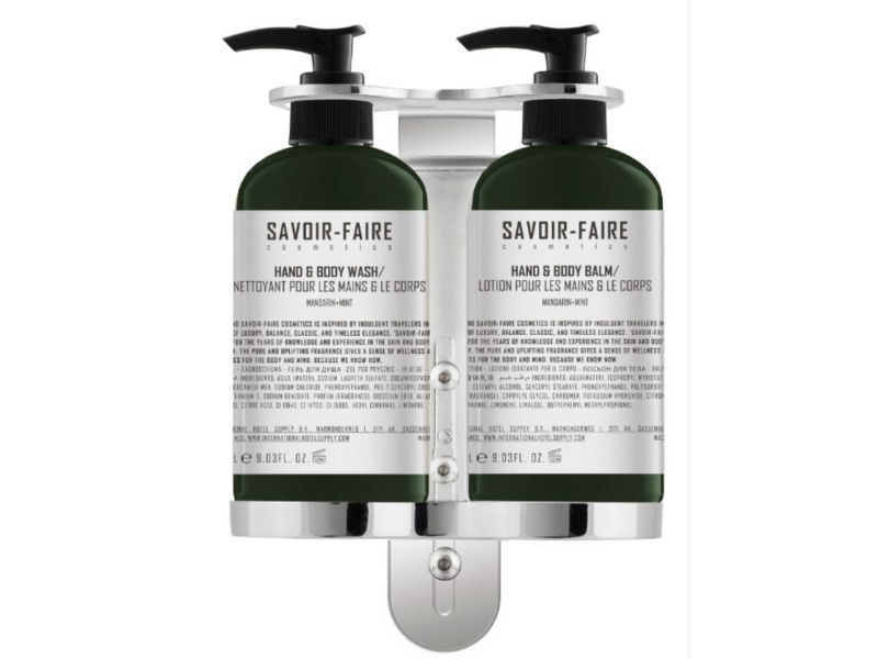 Savoir-Faire Stainless Steel Double Bracket, designed to securely hold 2 Savoir-Faire 267 ml pump dispenser bottles.