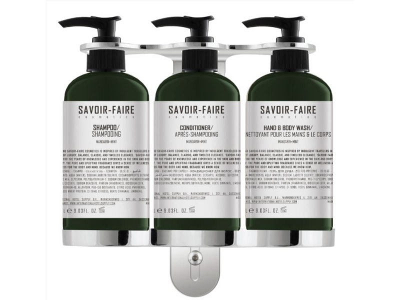 Savoir-Faire Stainless Steel Triple Bracket, designed to securely holds 3 Savoir-Faire 267 ml pump dispenser bottles.