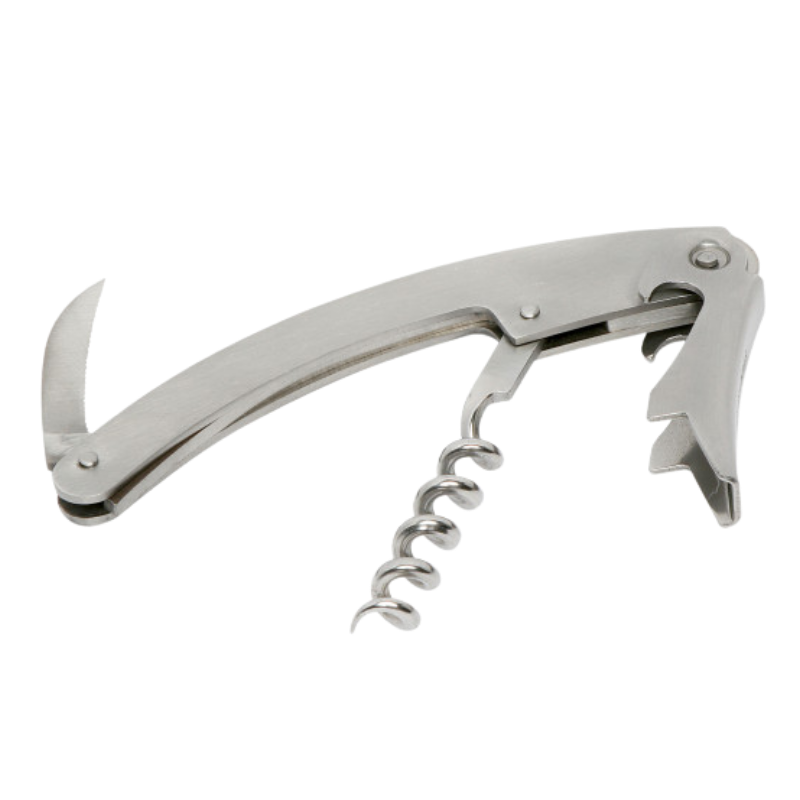 The Wiltshire Waiter's Friend is a compact all-in-one corkscrew opener, traditionally used in restaurants. It also features a crown top bottle opener and a foil cutter knife that fold inside one another for convenient storage.