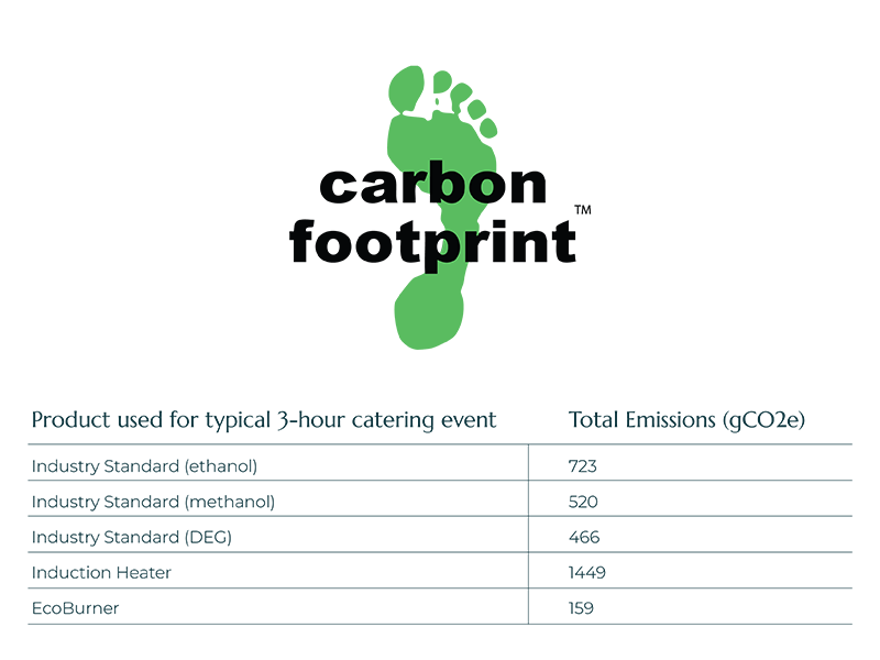 • Lower Carbon Emissions: EcoBurner cuts buffet carbon emissions by up to 78%. A 2020 study showed it emits only 159 gCO2e during a 3-hour event compared to 723 gCO2e from ethanol gel.