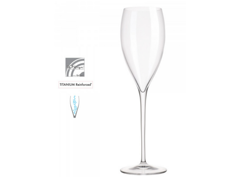 Classic champagne flute with long stem and elegant shape for a sophisticated table setting. An indentation in the bottom of the bowl creates a continuous flow of bubbles. Stems are strengthened with a patented anti-abrasion titanium treatment for lasting durability.