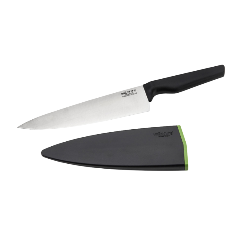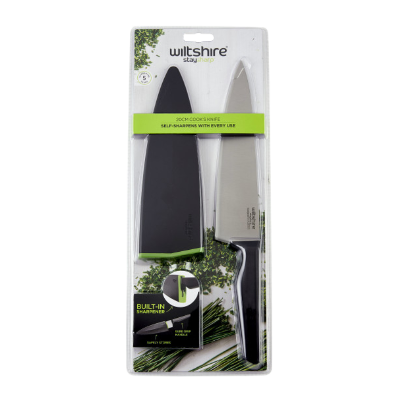 The perfect kitchen tool, ideal for cutting larger fruit, vegetables, herbs, and meat. This knife makes light work of food preparation with its Staysharp blade. Thanks to the patented self-sharpening system you can ensure no more blunt knives. The workhorse of the kitchen, the Staysharp Cook's Knife can be used for almost all food preparation. Thanks to the clever self-sharpening system of Staysharp you can ensure no more blunt knives. Simply insert and withdraw the knife from the scabbard for a sharp knife every time. Ideal for cutting larger fruits, vegetables, herbs and meat. Like all Wiltshire knives, it’s made from superior quality stainless steel so it’s rust-resistant. An essential in every kitchen, it's the go-to knife that makes light work so that you can cut and chop with ease.