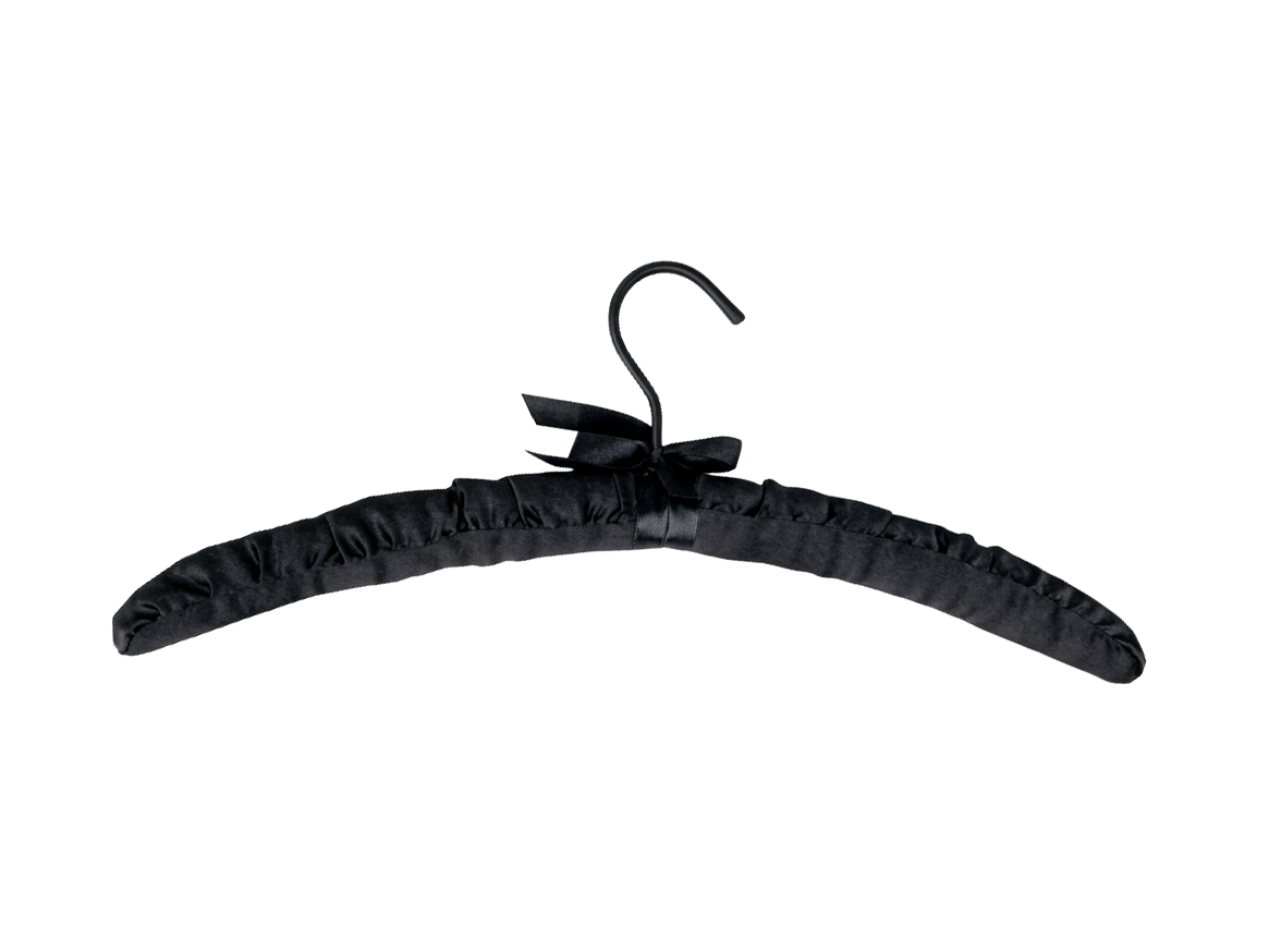 Foam padded hanger covered in satin material, decorated with a bow. Curved shape with metal hook for garment support.
