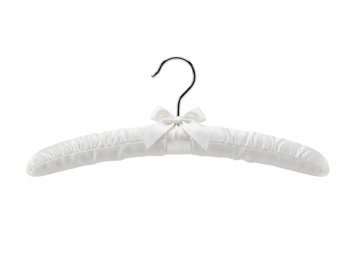 Foam-padded satin hangers with a decorative bow, designed to add a touch of elegance to your wardrobe or guest rooms. The curved shape helps garments maintain their form, while the metal hook provides secure hanging.