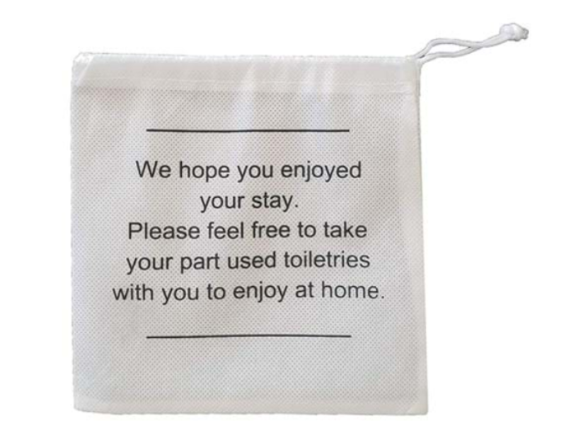 These white non-woven bags are perfect for holding guest toiletries that they wish to take home after their stay. This helps your sustainability as you are encouraging guests to use the contents of the toiletries rather than disposing of half-used tubes.