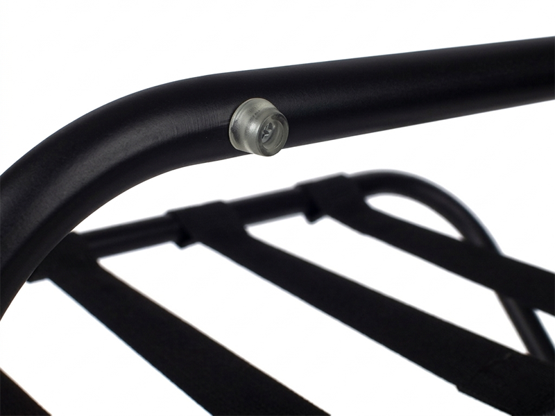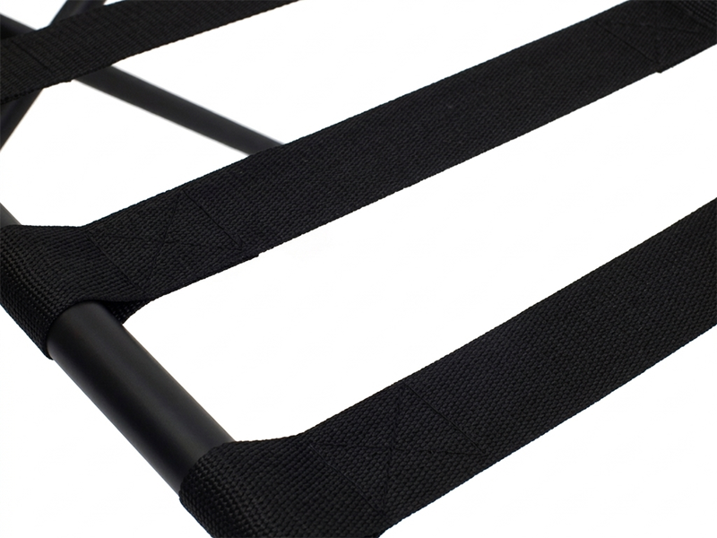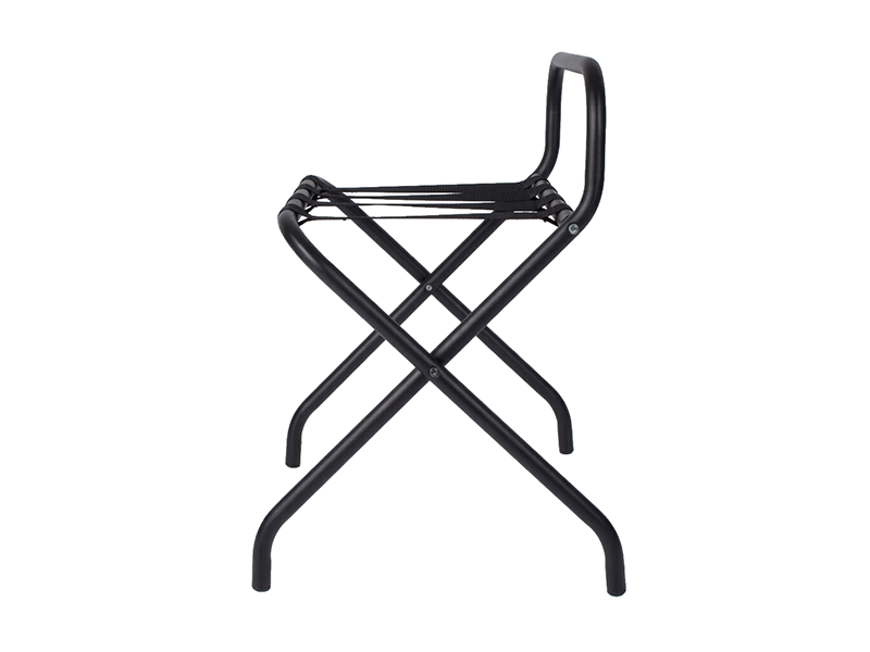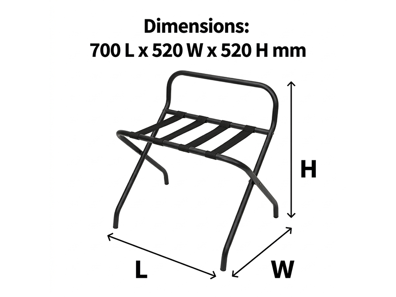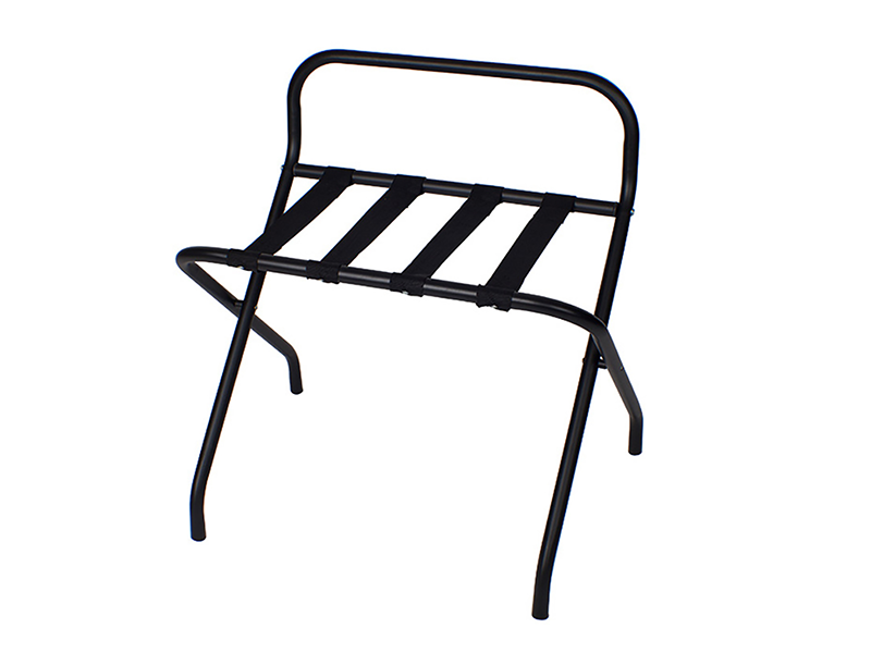 Designed for durability and convenience, this Black Luggage Rack with High Back is ideal for hotel guestrooms. Featuring a sturdy frame with four strong support straps, it provides reliable luggage support while clear rubber bumpers protect walls. Its foldable design allows for easy and compact storage when not in use.