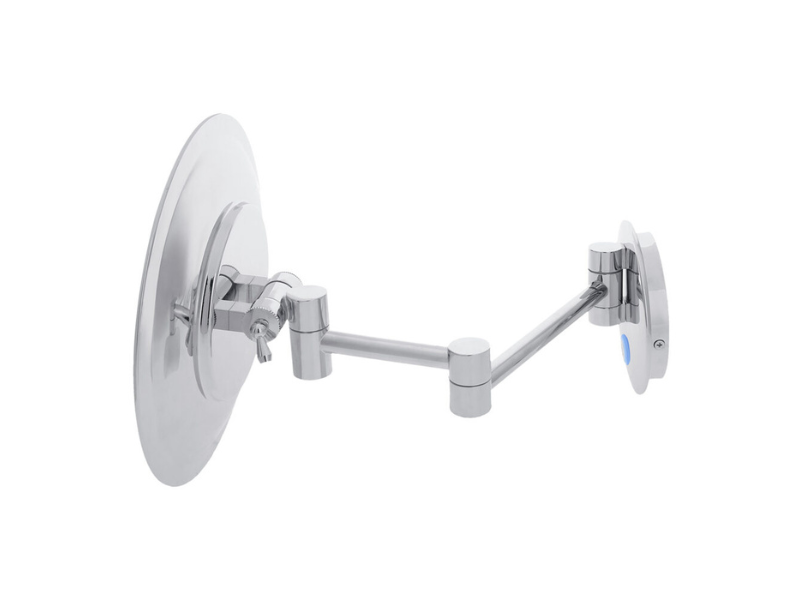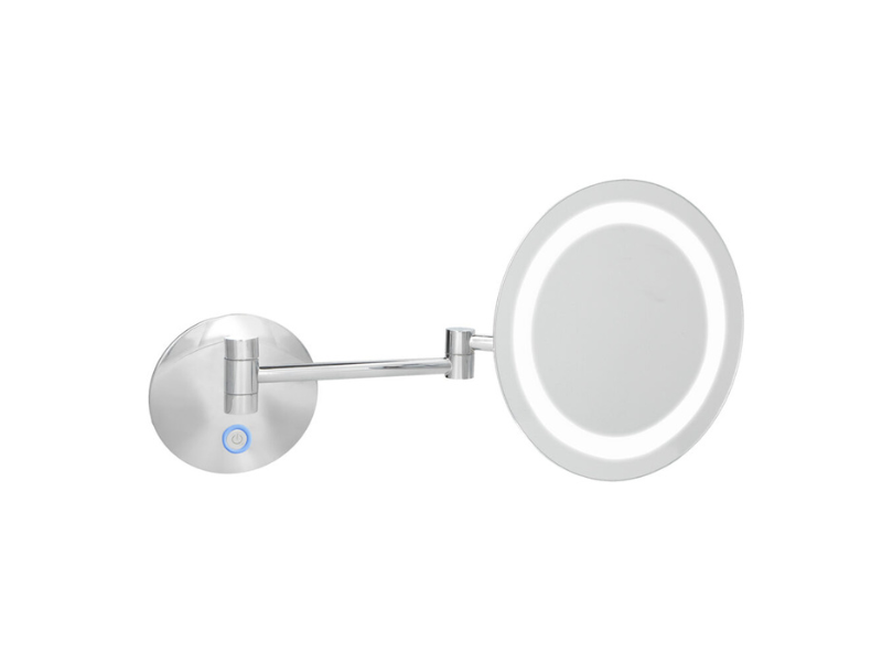 Celeste illuminated round mirror with tubular chrome brass arm with 2 lighting options: warm or cold white
