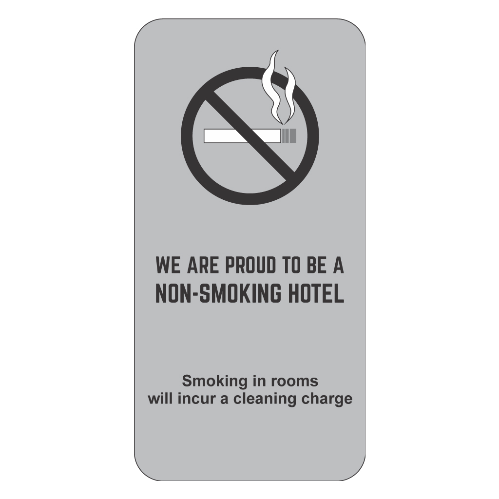 1mm rigid PVC wall mount No Smoking Sign, metalic silver with black text, rounded corners and sticky tape on the back.