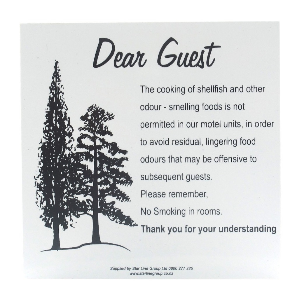 "Dear Guest, the cooking of shellfish and other odour smelling foods is not permitted in our motel units in order to avoid residual, lingering food odours that may be offensive to subsequent guests. Please remember; no smoking in rooms. Thank you for your understanding"