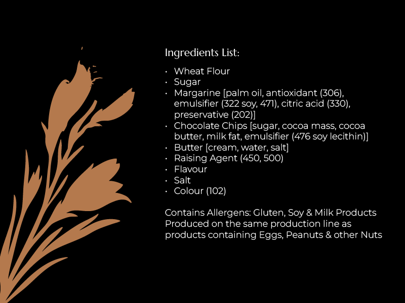 • Chocolate Chips [sugar, cocoa mass, cocoa butter, milk fat, emulsifier (476 soy lecithin)]