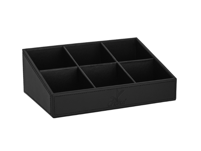 This striking leather look tea box tray is perfect for presenting different kinds of Chanui tea to your guests. Featuring six compartments which gives full view of the contents. Provide a first rate impression of your establishments with this charming tea box, ideal for hotels and guestrooms, breakfasts and buffets.