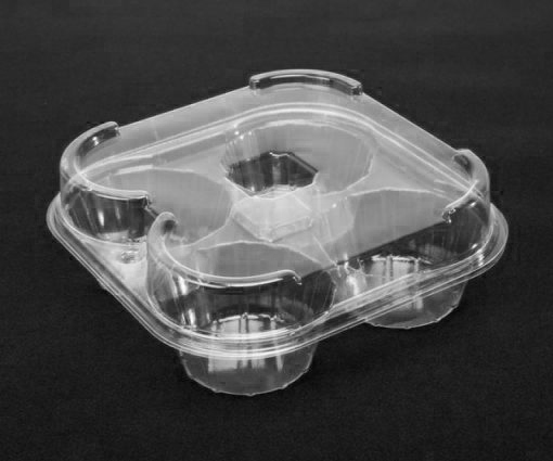 One piece 4 Texan Muffin clam with clickable fold over lid. Made from NZ recycled PET (rPET). 100% recyclable after use. Perfect for displaying 4 large savoury or sweet muffins. Sold in quantities of 100 per outer.