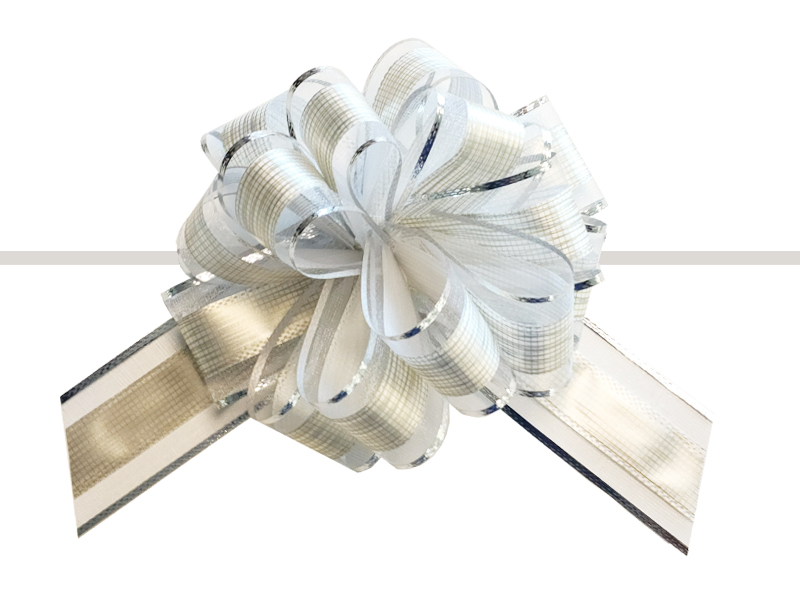 Decorate hampers and gifts with this beautiful on-sheer Luxury Large Silver Organza Pull Bow. Super easy to assemble. No glue, no staples - no tape! Sold in quantities of 50 per outer.