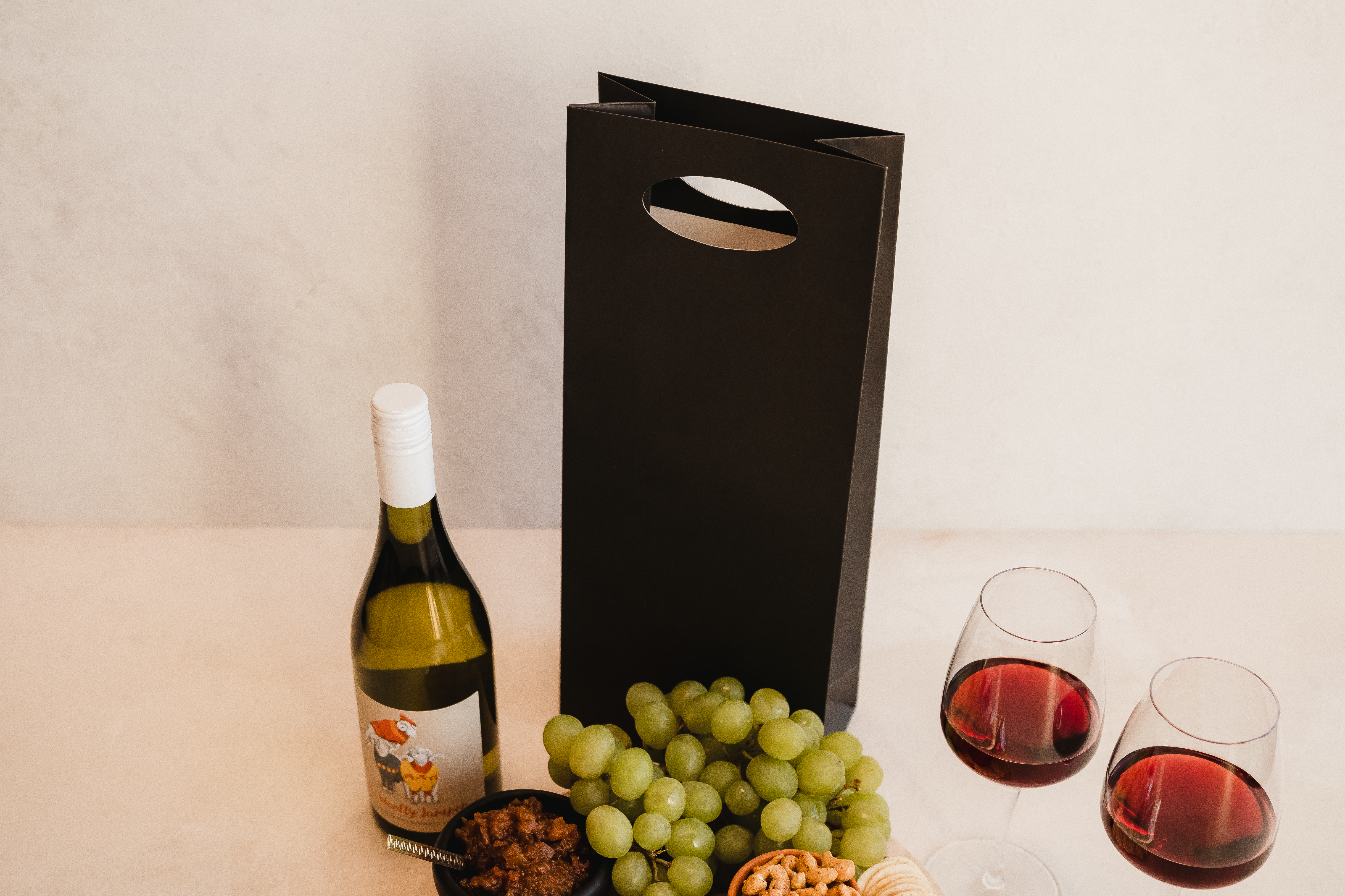 Die cut handle wine bags give a simple yet sleek presentation that will enhance your cellar door experience. Made from strong & durable black coloured kraft paper that is recyclable and reuseable. Reinforced base and handle suitable for two wine bottles. Sold in quantities of 100 per outer.