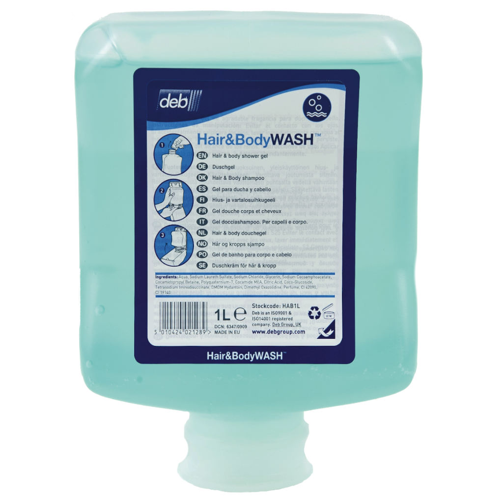 This shower gel comes in a 1-liter cartridge that is ultrasonically sealed, non-vented, and recyclable (HDPE Type 2). Deb's shower gel is formulated for one dose (1.0 mL for 1 Liter) application. Use with: Deb Hair & Body Wash Dispenser.