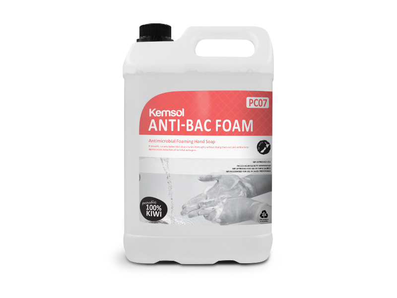Kemsol Anti-Bac Foam is a smooth, creamy foaming hand soap that cleans thoroughly without drying. Contains triclosan and antimicrobial agents for safe, hygienic hand care, with skin conditioning properties for soft, healthy hands.